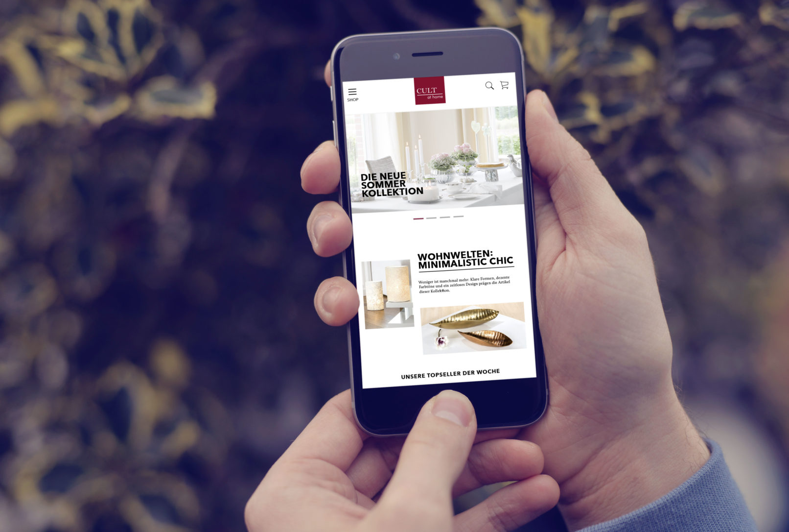 Für den Cult at Home Webshop haben wir einen umfassenden Layoutvorschlag im modernen Responsive Design erarbeitet. Neben der einfachen Auffindbarkeit sowie Auswahl der einzelnen Produkte, wurde großen Wert auf die emotionale Präsentation der umfangreichen Produktwelten gelegt. Das stöbern und endecken innerhalb des Shops, soll für den Kunden zum Erlebnis werden. Ein neues Farbsystem gibt einen schnellen Überblick über die einzelnen Katagorien und verleiht der Produktvielfalt Ordnung und Struktur.